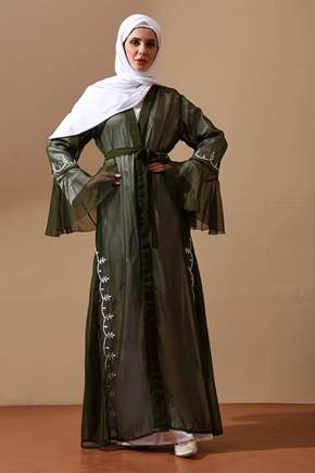 Gulf heritage meets minimal tailoring. Deep green, sand, or black open-front abayas are edged with geometric Sadu borders that provide definition and structure without weight.
